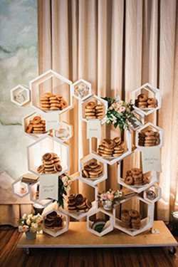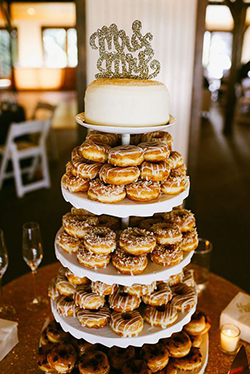 Beignet sucré de forme circulaire, le donut peut se décliner en de nombreuses saveurs grâce à son glaçage, qui le rend également très esthétique. Adapter cette pâtisserie à votre décoration de mariage en l’accordant à votre thème ou à vos couleurs !
