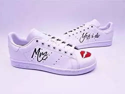 Si vous souhaitez apporter à votre paire de sneakers de mariage une petite touche de votre personnalité, customisez-les ! Vous pourrez être sûr que personne n’aura les mêmes que vous ! Ainsi, vous changerez le design à votre convenance. Cette paire sera exactement comme vous les avez imaginées et 100 % unique. N’est-ce pas génial ? Vous pouvez y ajouter vos initiales, un message, les broder, dessiner quelque chose dessus, mais aussi changer les lacets, apporter d’autres couleurs, formes… D’ailleurs, si vous avez choisi une paire de baskets blanches, il est possible de la customiser vous-même ou de faire appel à un professionnel !