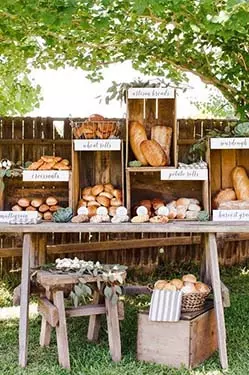 - Placez de grandes tables en bois pour votre buffet de vin d’honneur. Vous pourrez aussi ajouter des étagères ou des commodes pour présenter les mets et créer des perspectives à votre buffet. Pensez également au candy bar ou bar à boisson qui sont devenus des éléments de décoration incontournables !
