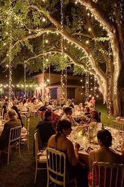 De plus, vous pouvez aussi utiliser des bougies et des chandelles pour donner un côté plus chaleureux et intime. Pour embellir l’endroit, éclairez la nature en faisant briller les arbres à l’aide de guirlandes lumineuses. En effet, pour réaliser un mariage en extérieur, les lumières doivent être bien visibles afin de donner un effet de mouvement de la nature. Celles-ci valoriseront les troncs des arbres et les plantes !