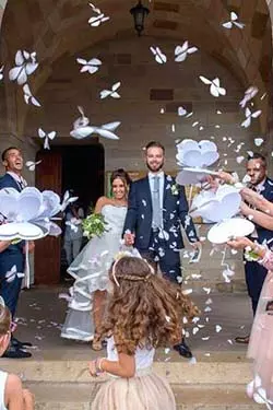 Pour que votre haie d’honneur soit à votre image, munissez vos convives de petits accessoires ! Ils pourront ainsi vous accueillir en conformité avec votre couple et votre thème du mariage. Pour un mariage romantique, prévoyez des pétales de rose, fleurs séchées, bulles de savon, des paillettes… ! Si vous souhaitez quelque chose de plus original et étincelant, pensez aux cierges magiques, aux feux du Bengale, boules de cotillons colorés, ou même aux ballons de baudruche. Comme vous pouvez le constater, beaucoup de choses peuvent être mises en place pour que vous ayez l’entrée des mariés dont vous avez toujours rêvé.