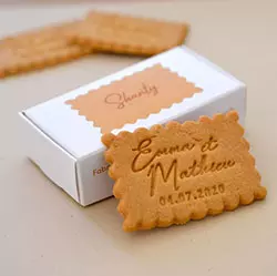 Qui n’aime pas les biscuits ? Commandez des sablés uniques et personnalisés à offrir en cadeaux à vos invités. Pour ravir les plus gourmands, vous pouvez choisir des petits gâteaux avec glaçage et y ajouter une touche de couleur. Pour une version plus simple, choisissez une forme originale et faites écrire un message dessus. Différents goûts sont également disponibles pour varier les plaisirs, tels que vanille, caramel au beurre salé, chocolat, citron et bien d’autres encore…