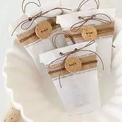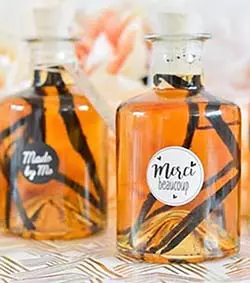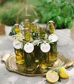 Offrez à vos invités des mignonnettes en verre remplies de la boisson que vous aurez choisie. Alcoolisée ou non, pétillante ou pas, cette attention leur fera plaisir dans tous les cas ! Créez votre propre liqueur de mariage, du rhum arrangé ou un cocktail de votre cru. Vous pouvez également trouver de petites bouteilles de champagne ou de vins avec des étiquettes personnalisées. Pour une version sans alcool, vous pouvez choisir d’offrir de la limonade, du sirop…Ou de l’huile d’olive pour que vos invités puissent agrémenter leurs plats !