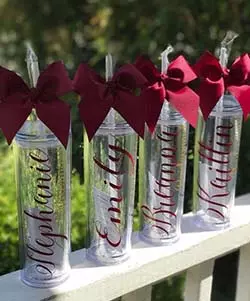 En plus d’établir un plan de table personnalisé et repérable, il vous est possible de faire confectionner des verres gravés aux prénoms de vos invités. Vous pourrez les accorder aux couleurs et au thème de votre mariage et vos invités repartiront avec un joli souvenir. Personne ne perdra son verre ! Pour ceux ayant les mains fragiles, vous pouvez choisir des Ecocup (gobelets réutilisables) ! En effet, la matière du verre peut varier selon vos envies, verre bien sûr, mais aussi bambou, bois, plastique…