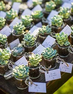 Vous souhaitez offrir des cadeaux durables dans le temps ? Nous vous proposons de disposer sur leur table de petites plantes, mini-plantes grasses, succulentes ou autres cactus ! Les invités pourront ainsi les ramener chez eux et les intégrer à leur décoration. Ils pourront nourrir votre amour en prenant soin de ces belles plantes ! Rien de mieux qu’un cadeau qui perdure dans le temps, qui évolue au fil des années !
