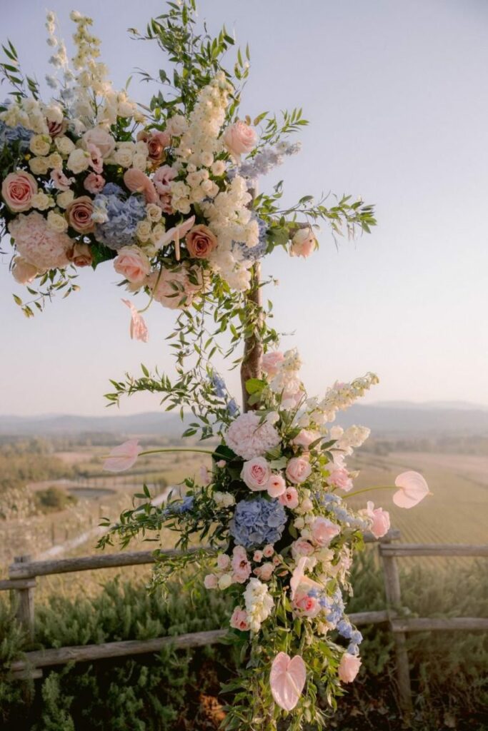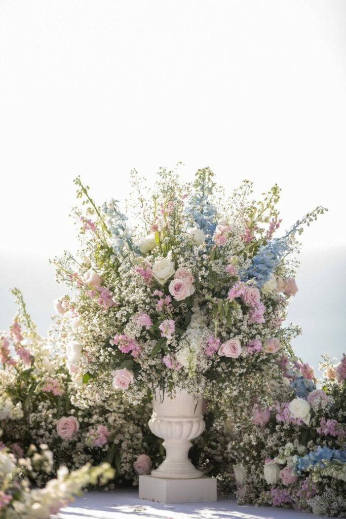 La disposition ne sera pas des plus compliquées, les fleurs se suffisent presque à elles-mêmes ! Ajouter quelques bougies, amphores ou voilages, ne fera qu’ajouter un plus à votre cérémonie !