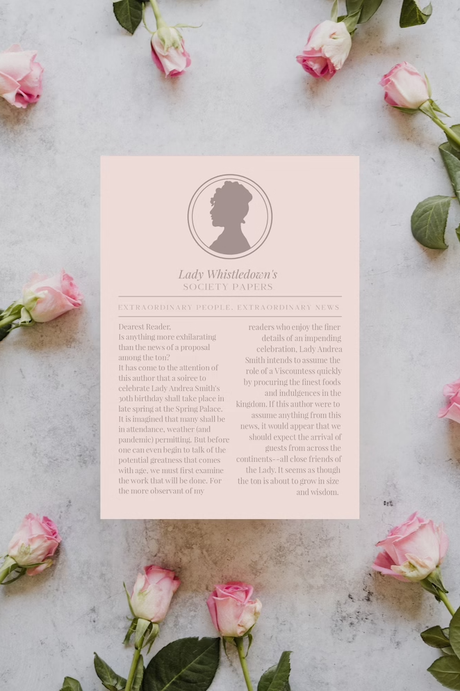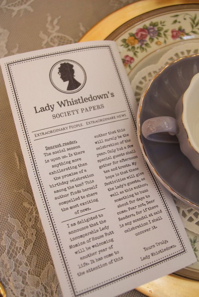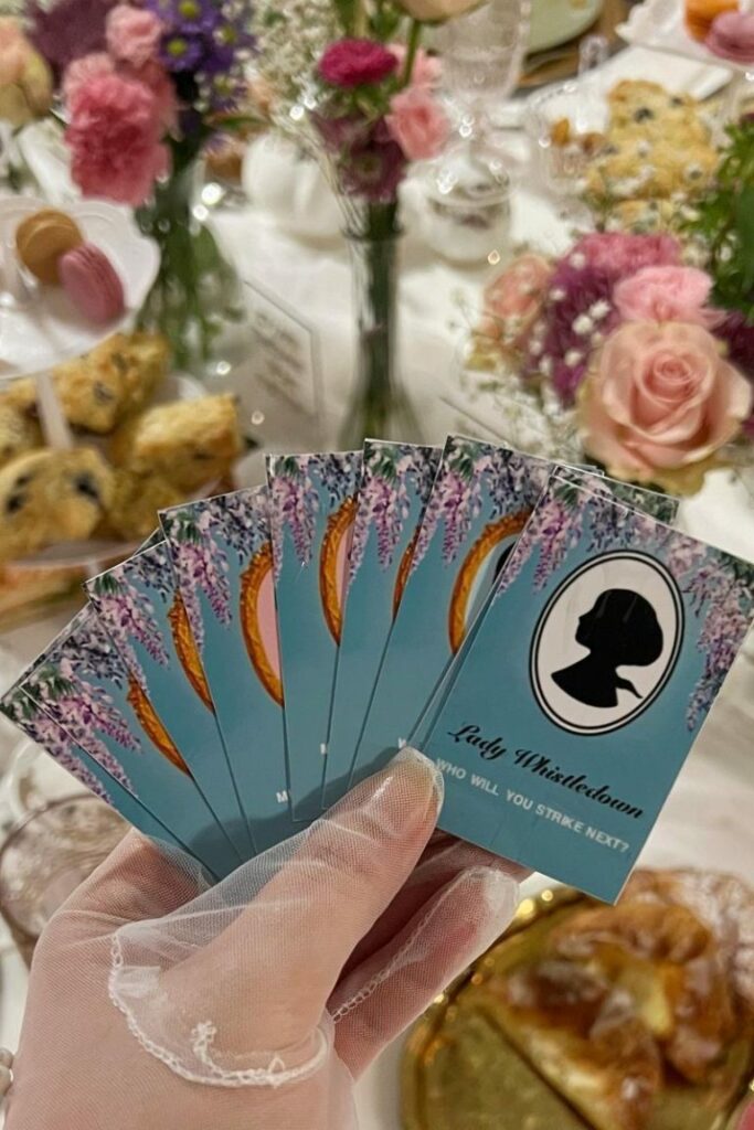 Bien entendu, Lady Whistledown s’invite pour raconter les derniers ragots de Londres. Choisissez l’histoire que vous voulez, cela amusera et occupera vos invités !