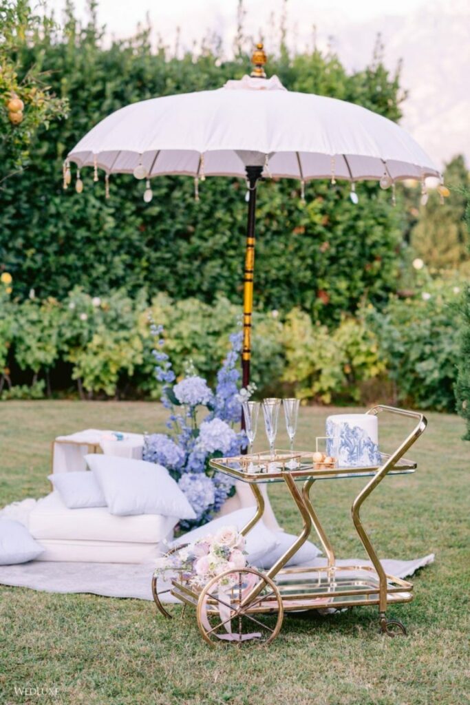 C’est le moment pour réaliser la plus belle garden party de l’année. Ombrelles, bar à thé (voire même offrir la petite tasse), barbe à papa (un peu plus vintage). Pour le cocktail, on pourra aussi y ajouter des fleurs, avec un “martini lavande” par exemple, une fontaine de champagne ou encore opter pour des cocktails colorés qui rappellent la fraîcheur. On joue beaucoup sur la superposition, l’accumulation pour donner l’impression d’abondance.