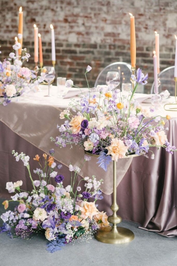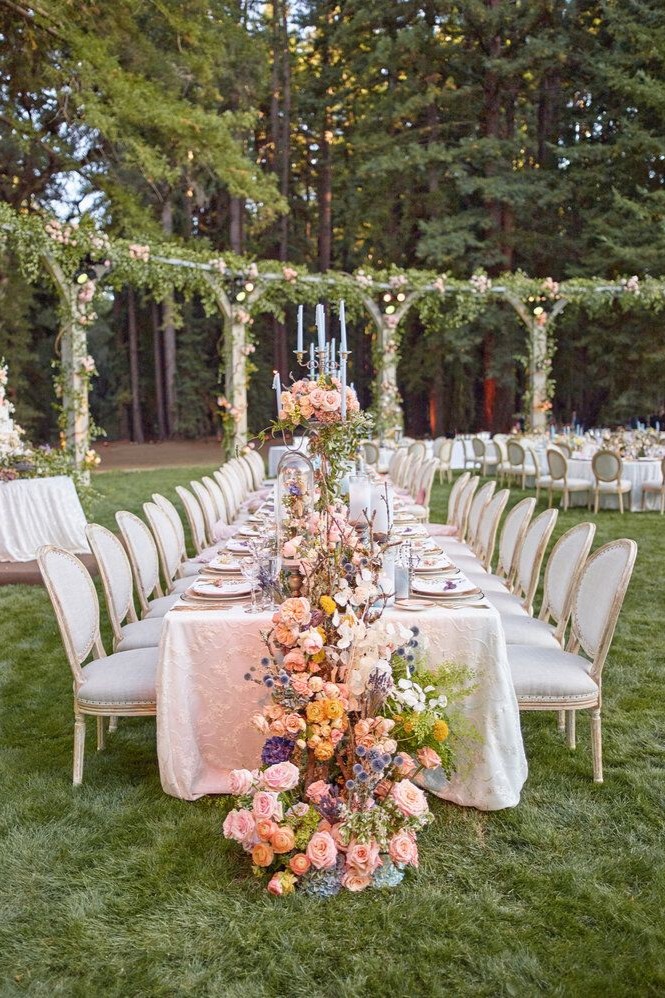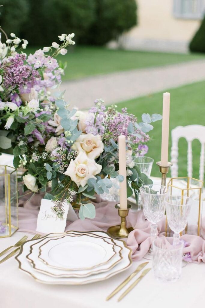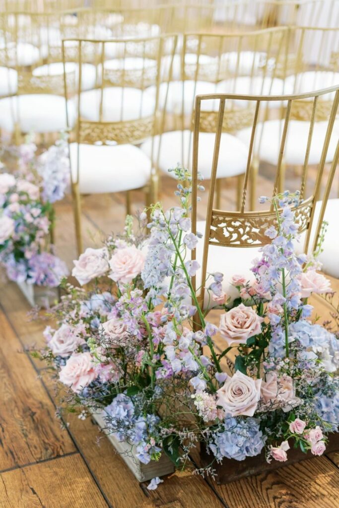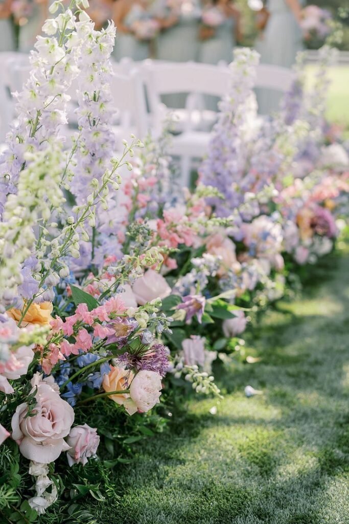 Il est temps d’épater la galerie. C’est le moment où vos invités arrivent et vont pouvoir s’imprégner de l’ambiance, et oui il va falloir que ça en jette ! Vous allez pouvoir voir les choses en grand, et pouvoir oser en faire trop. Mais attention tout de même à rester raffiné. Au rendez-vous, assemblage de fleurs, dans les tons pastel : on retrouve les roses, les œillets, le delphinium, la lavande, la glycine, et de la verdure pour agrémenter tout ça.
