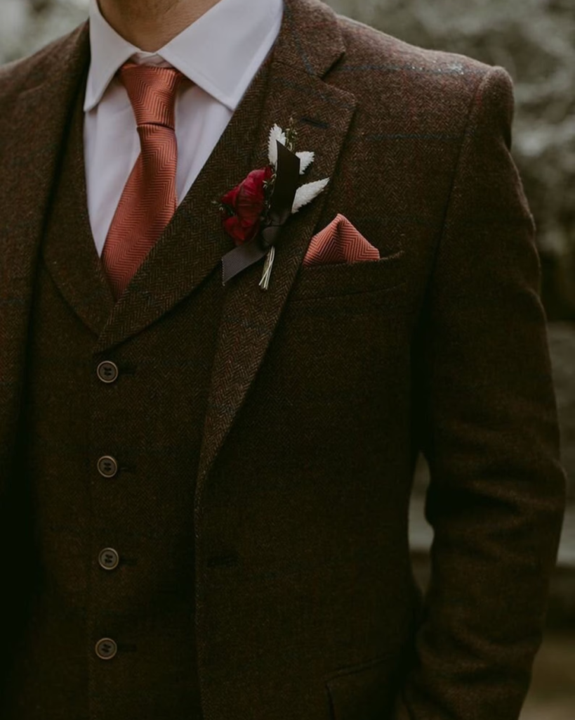 Si vous voulez rester classique, optez pour les manches longues ! Il existe de nombreuses robes à manches qui se prêteront parfaitement à cette occasion. Vous pouvez aussi faire le choix de porter un mateau, un boléro ou encore une cape à passer par-dessus votre tenue. Et pour celles et ceux qui préfèrent les costumes, vous pouvez jouer sur les matières, par exemple, le tweed !