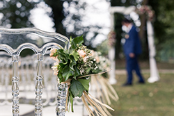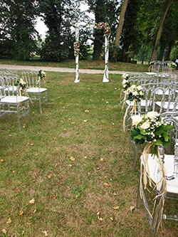 Les mariés avaient choisi des chaises Napoléon transparentes, fleuries des petites compositions blanches et orangées que leur fleuriste avait préparées. L’arche en bois se faisait en rappel des caisses bois, et rondins qui décoraient l’entrée de cérémonie. Enfin, ils avaient choisi un panneau de « Bienvenue » en bois personnalisé avec leur prénoms.