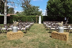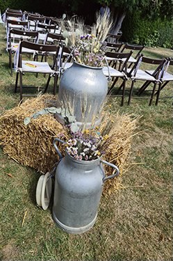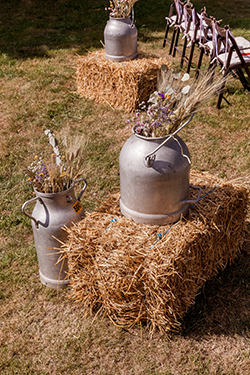 - Ballots de paille pour les décorations d’entrée de cérémonie, avec de gros pots à lait et des compositions de fleurs des champs