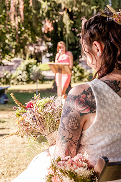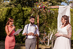 Une fois installés, nous avons pu commencer la cérémonie. J’ai commencé par raconter l’histoire de leur vie de couple, expliquer les raisons qui les ont motivés à se marier, et pris le temps d’imaginer leur avenir. Les proches sont ensuite intervenus. Les amis et la famille, ce sont eux qui apportent la touche émotion et rire à la cérémonie. Ils y mettent du coeur, ils se livrent. Parfois on pleure, parfois on rit. C’est le moment de tout se dire, de prendre le temps de s’avouer ce qu’on ne se dit jamais.