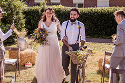 Les mariés sont arrivés dans un cortège original, d’abord les proches, puis eux en dernier, avec un joli vélo vintage fleuri.