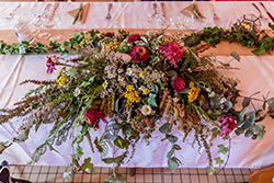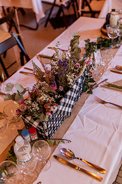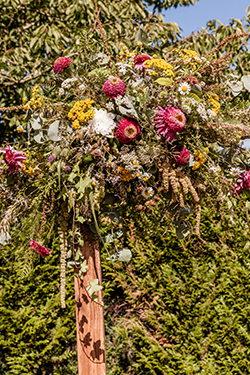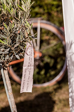 J’aime beaucoup ce rituel qui est riche de sens. Et pour lui en donner encore plus, les mariés ont choisi de le personnaliser. Fans de musique, ils ont choisi des paroles de chansons qui leur sont chères, qu’ils ont écrit sur des bouts de tissu. Puis, après les avoir énoncées, les ont accrochées aux branches de leur olivier.