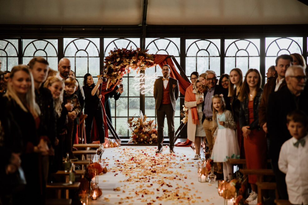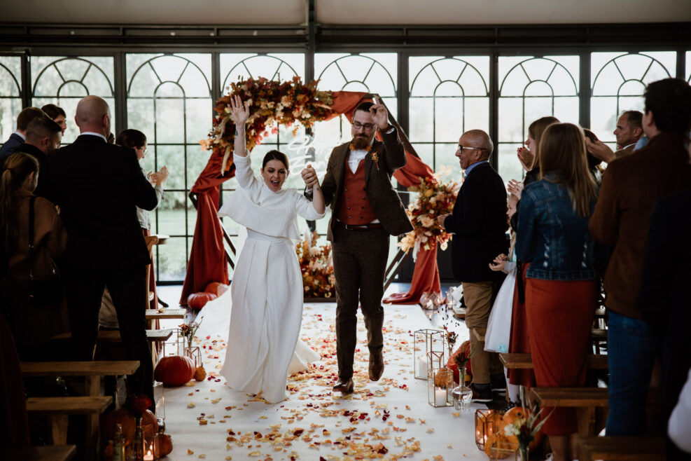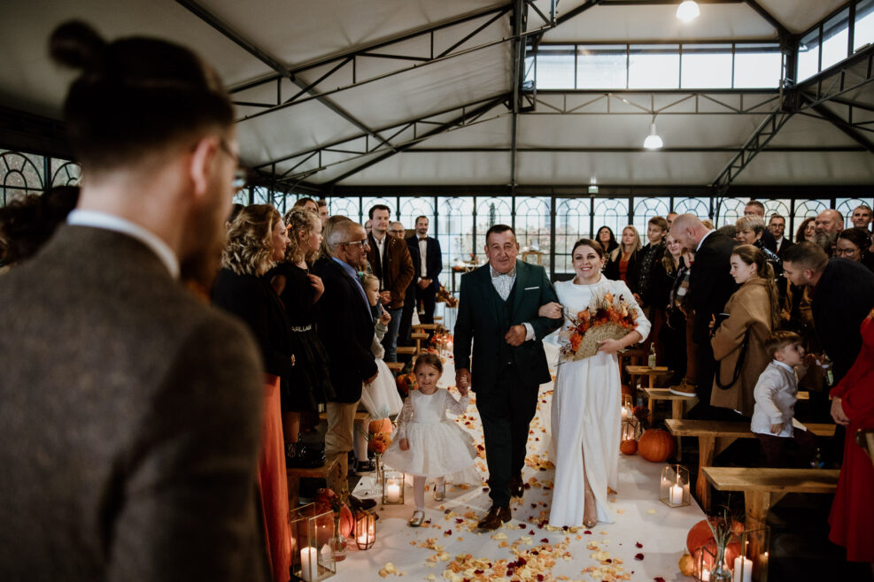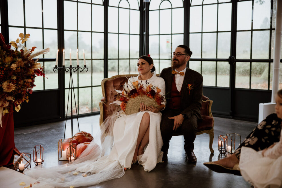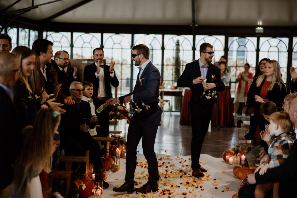 Et c’est dans l’orangerie illuminée par ces chaleureuses couleurs d’automne que nous célébrons cette cérémonie. Une cérémonie pleine d’amour, de bienveillance et de joie qui commence par une distribution de bières ! Eh oui les pétales de fleurs ne sont pas au goût de nos chers mariés !