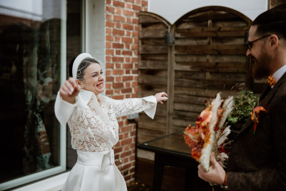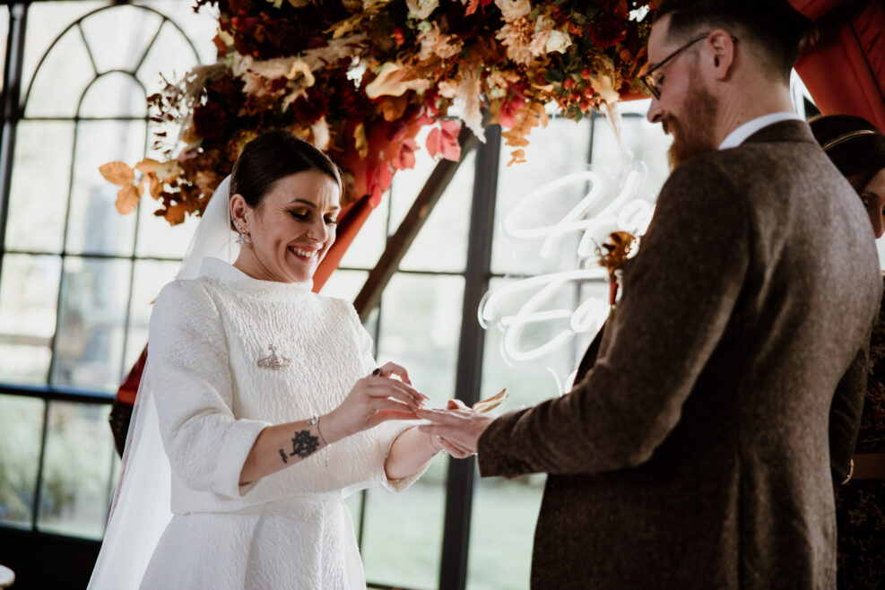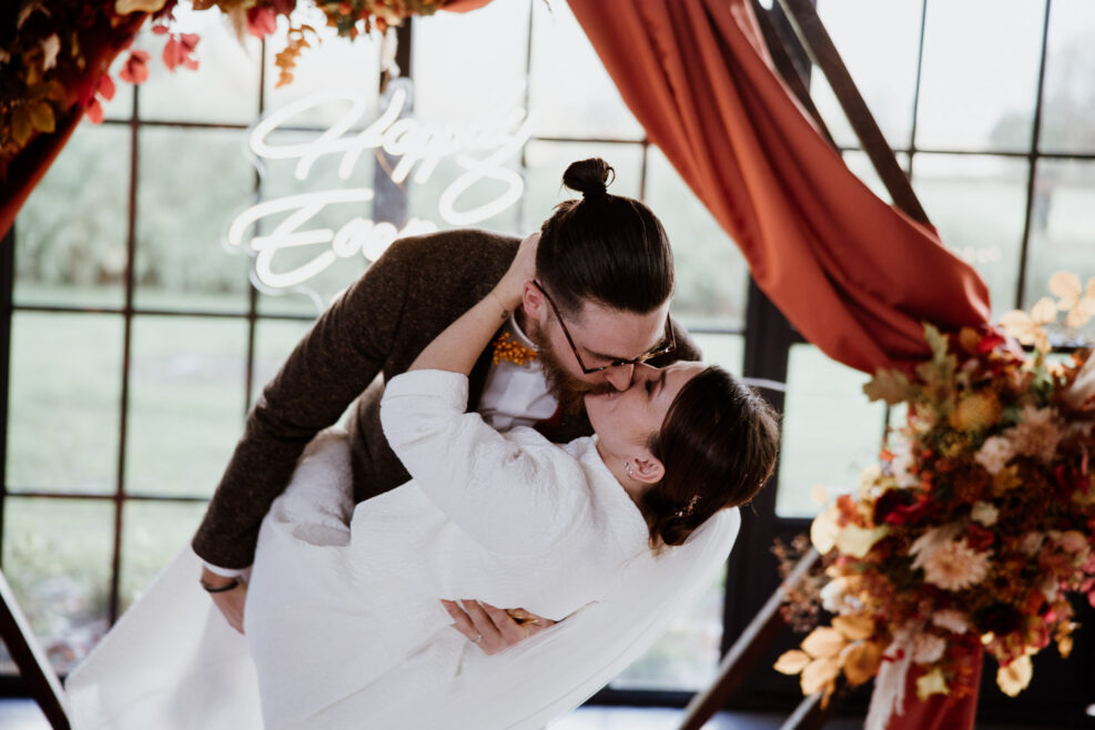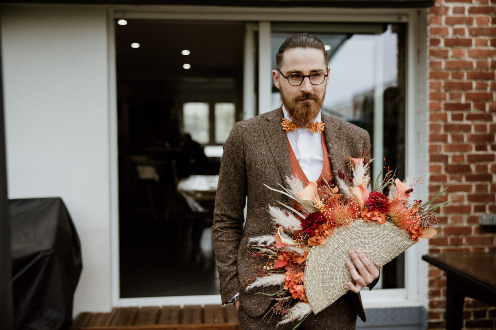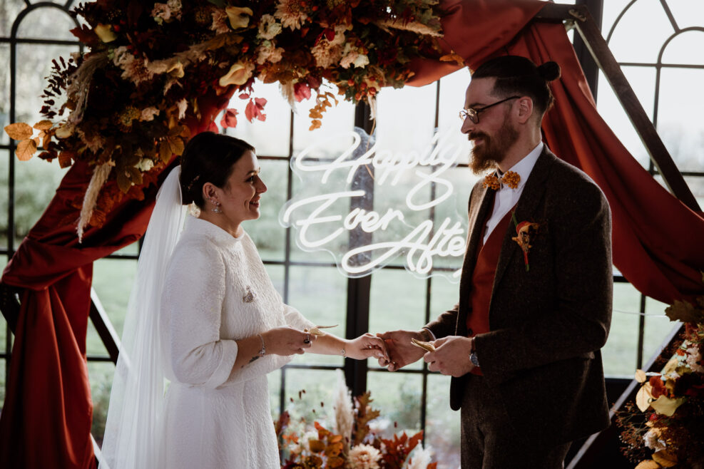 Et c’est dans l’orangerie illuminée par ces chaleureuses couleurs d’automne que nous célébrons cette cérémonie. Une cérémonie pleine d’amour, de bienveillance et de joie qui commence par une distribution de bières ! Eh oui les pétales de fleurs ne sont pas au goût de nos chers mariés !