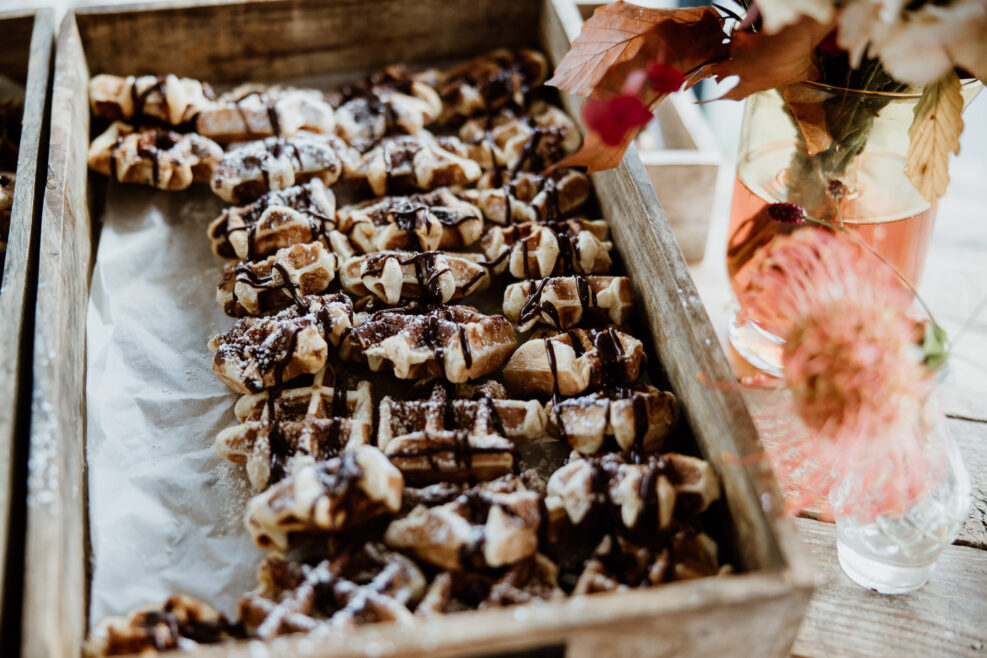 Une fois les nombreux discours, les larmes (de joie), les vœux, les déclarations d’amour et les bisous passés, la cérémonie touche à sa fin. Et c’est avec des gaufres au chocolat super réconfortantes et des boissons chaudes en tout genre (café, chocolat, jus de pomme, vin) que l’on continue la journée !