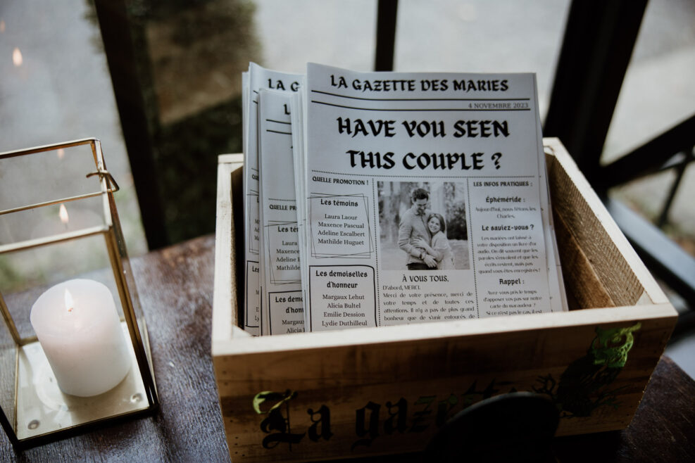 Tout était dans les détails ! Avez-vous déjà vu la “Gazette de nos mariés”? C’est un joli moyen de remercier la présence de vos invités, de leur glisser quelques informations sur les animations de la soirée ou de leur présenter vos témoins !