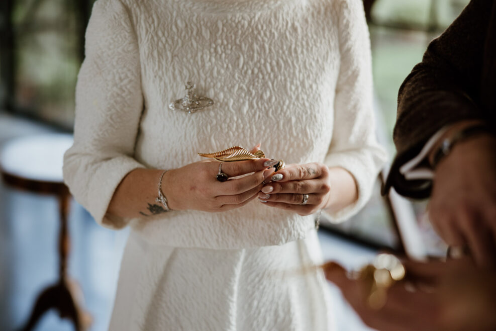 Anaïs et Thomas ont choisi un rituel complètement dans leur thème mélangeant Harry Potter et le rituel symbolique des alliances. Ils ont alors choisi de les placer dans un Vif d’Or, un objet très célèbre dans la saga, représentant la victoire et la détermination. Passant de mains en mains, les alliances étaient ainsi chargés de toutes les ondes positives de chacun des invités.
