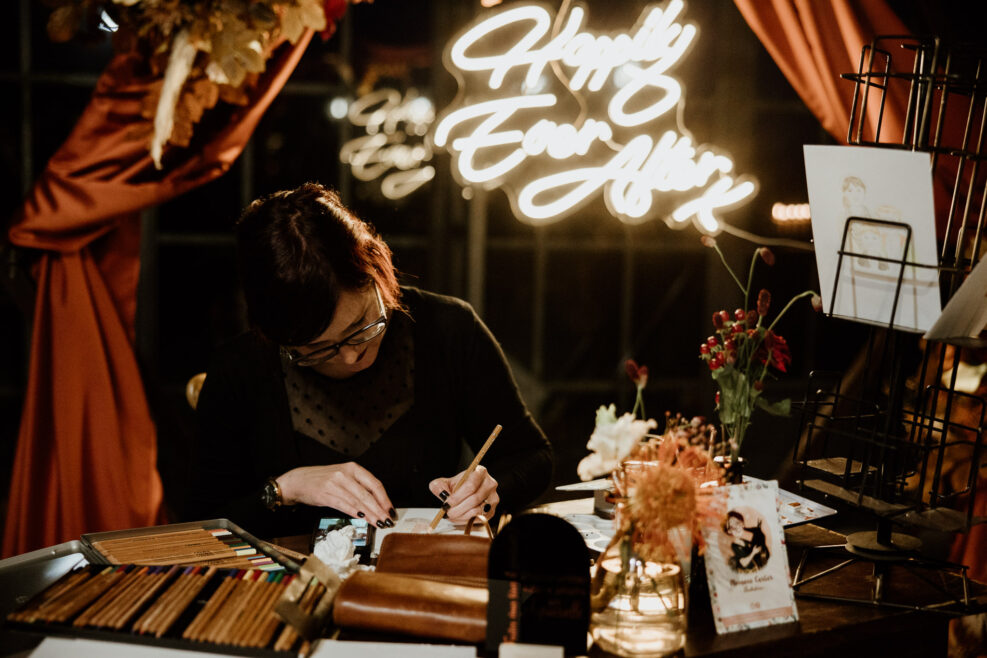 Et pour animer toute cette splendide décoration nos mariés ont choisi le livre d’or audio de chez Laissez-nous un message ainsi que les magnifiques dessins en aquarelle de Morgane. Les invités sont repartis avec des portraits d’eux réalisés durant la soirée, si ça ce n’est pas un super souvenir !