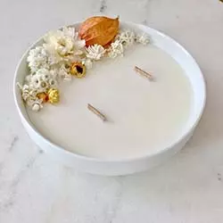 Pour allier la beauté du geste et de l’objet, vous pouvez opter pour une bougie personnalisée avec des fleurs séchées. Commandée chez un artisan, ou même créée par vous même en DIY !