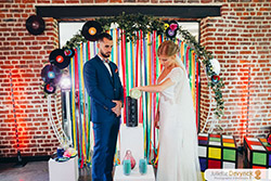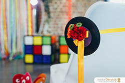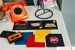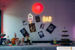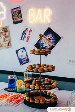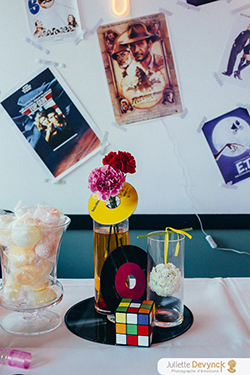 Marie a pensé toute la décoration de salle de mariage, et chacune des tables nous invite à un voyage temporel. On y découvre des tonnes de détails qui nous ramènent en enfance, ou nous rappellent de joyeux souvenirs. Boites à cassettes, vinyles, Rubik’s cube, bobines photos… chaque invité y va de son anecdote avec ces objets maintenant disparus de nos vies. En jetant un oeil sur le buffet et le candy bar, c’est une ambiance flashy qui nous attend. Néons et affiches de films nous plongent totalement dans l’univers.