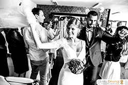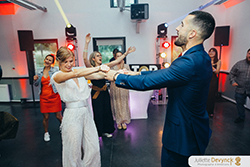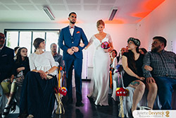 L’heure d’accueillir les mariés est là, au son d’une musique dynamique ! Tout le monde se lève pour acclamer Anaïs et Marc-Antoine ! Surprise ! La belle a changé de tenue pour revêtir une sublime robe combinaison. Elle scintille et brille de milles feux. C’est une tenue incroyable qu’Isabelle a choisi pour elle, pour la seconde partie de journée. Son mari est subjugué par sa beauté. On entend des claps, des cris de joie, qui donnent le ton de la soirée !