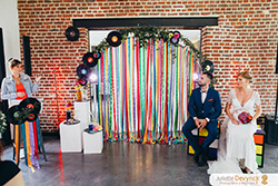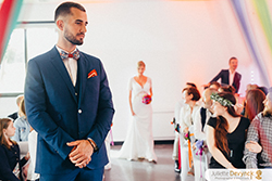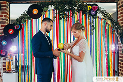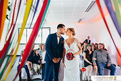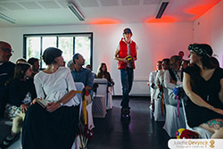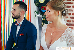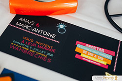 Aurélie, de Love & Life Events, accueille les invités et les dirige vers la cérémonie laïque. C’est d’ailleurs un type de cérémonie qu’ils n’ont encore jamais vu, et qu’ils ont eu le plaisir de découvrir sur le faire-part reçu. L’Imprimerie Mérigond a pensé et réalisé l’ensemble de la papeterie du mariage, dont l’invitation. Les couleurs, les formes, le texte: tout laissait à penser qu’une journée pop et flashy les attendait !