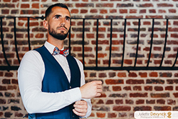 Pendant que sa douce se fait chouchouter, Marc-Antoine prend enfin le temps de se préparer. Thomas, de Keitel Lille, a choisi de lui proposer un costume de mariage sur mesure d’un bleu intense. Pour accessoiriser le tout, un nœud papillon pop et coloré vient dynamiser l’ensemble. Il est enfin prêt !