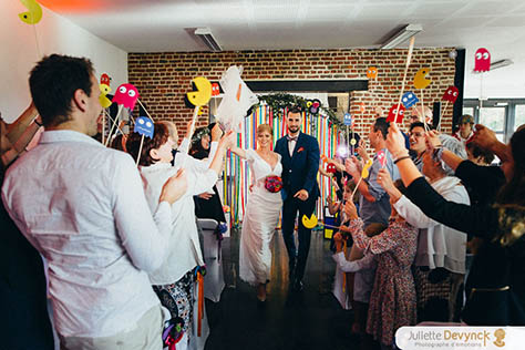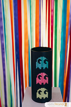Aurélie débute la cérémonie. Elle retrace l’histoire des mariés, les grandes étapes de leur vie de couple… Quelques membres de la famille, quelques amis prennent la parole, puis vient le moment du rituel. Anaïs et Marc-Antoine ont choisi le rituel du sable, revisité ici en version geek ! Le contenant, une fois rempli, laisse apparaître les petits monstres de l’univers Pac-Man. Un joli clin d’œil au thème du jour.