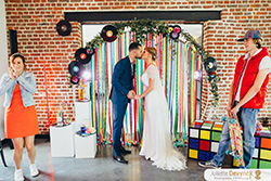 Dans un nuage de fumée, le futur marié arrive. Ça y est, nous y sommes ! La Ferme Saint Chrysole lui ouvre ses portes, et il y découvre un univers pop et coloré. Aucun doute, il a fait un bond de 30 ans en arrière !